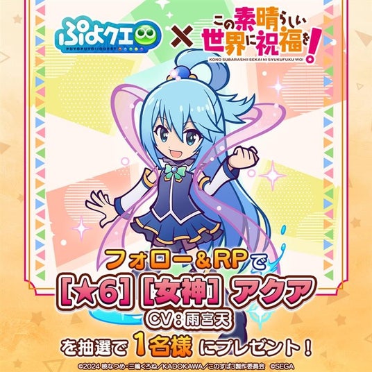 「この素晴らしい世界に祝福を!」とのコラボイベント開催を記念して、『ぷよぷよ!!クエスト(ぷよクエ)』公式Xアカウントと公式Instagramアカウントにて、参加した方の中から抽選で、コラボに登場するキャラクターをプレゼントするキャンペーンを順次開催中です。ぜひご参加ください。