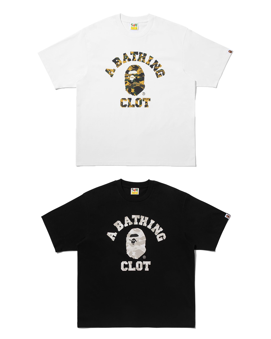 リラックスフィットのTシャツは、クリーンなデザインが特徴。カレッジテイストのグラフィックをベースに、コラボレーションならではのカモパターンとCLOTのロゴを組み合わせ、BAPE(R)のルーツであるストリートカルチャーへのオマージュを表現しています。
