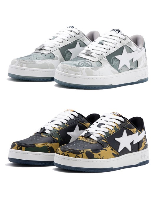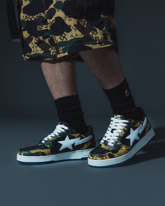 BAPE(R)の定番スニーカー「BAPE STA(TM)」も、コラボレーション仕様にアップデート。アッパーには特別なカモ柄を採用し、アウトソールにはシャークとドラゴンのグラフィックを透過プリントで表現。