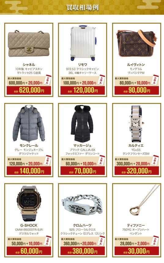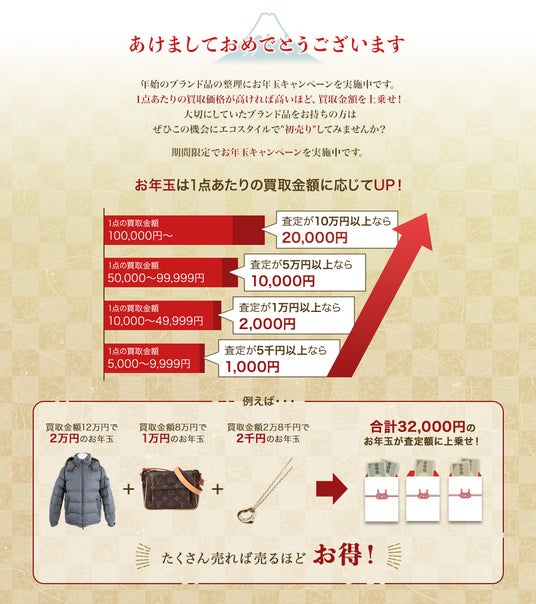 本キャンペーンでは、査定額に応じて最大20,000円を上乗せ。年始の整理や買い替え需要が高まる時期にあわせ、洋服・ブランド品をよりお得に売却いただける機会を提供します。