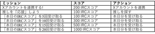 本期間限定企画「新春スコアザクザクキャンペーン」は、IRCスコアをより獲得するための、新春限定のスコア獲得キャンペーンです。 キャンペーン期間中、IRC APP内に表示されるステップ形式のミッションに沿って、Xアカウント連携や「推し」の 応援、毎日のスコア受け取りなどのアクションを行うことで、IRCスコアを獲得することができます。 ミッションは段階的に用意されており、ステップを進めるごとに獲得できるスコアが増加するため、アプリを日常的に利用しながら、特典の一つであるチケットアップグレード抽選への応募に必要なスコアを効率的に貯めることが可能です。