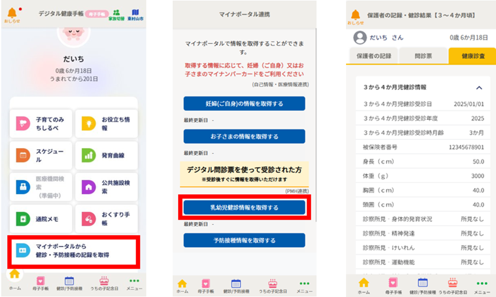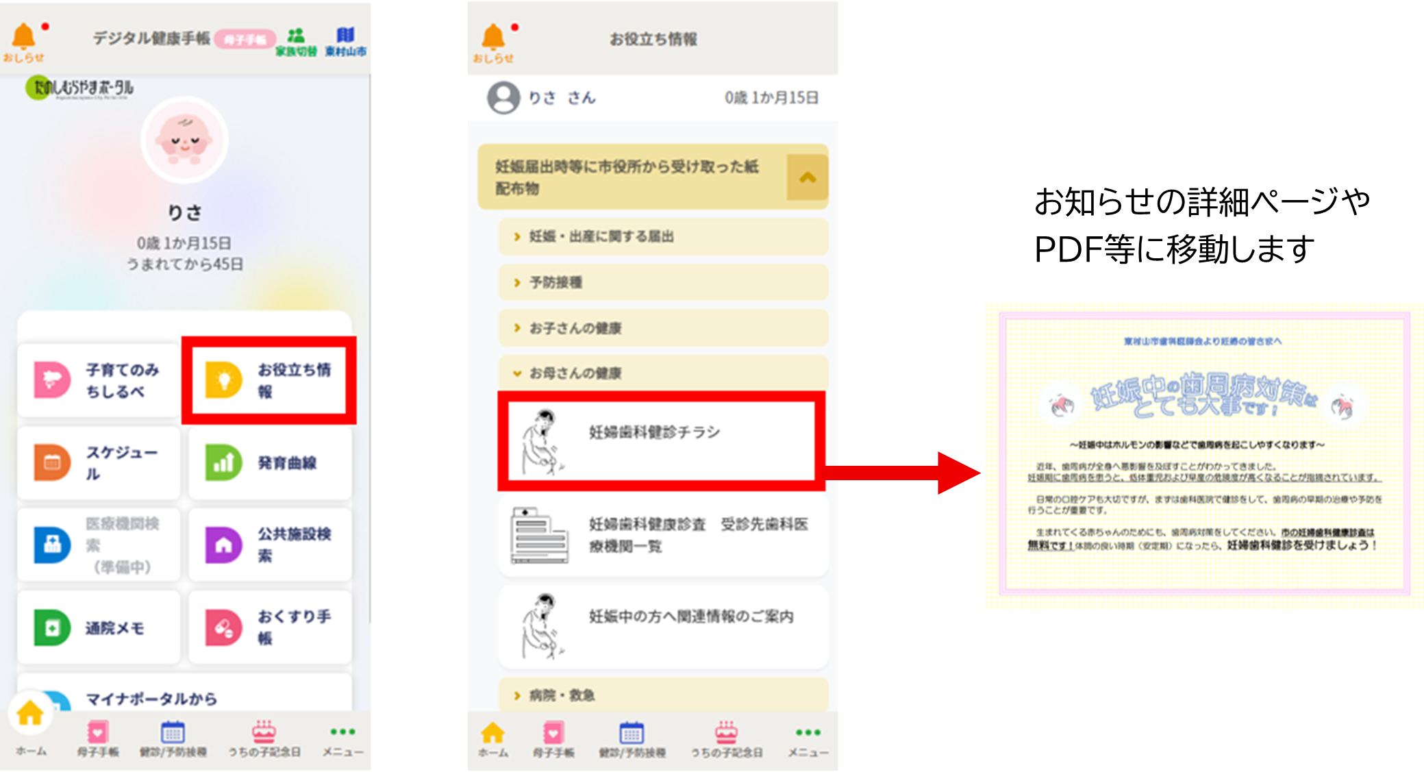 - 紙の母子健康手帳は、これまでどおり東村山市役所から交付を受けていただくとともに、健診や予防接種等の際には、紙の母子健康手帳をお持ちください。