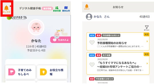 利用者の皆様の妊娠週数や月齢等に応じて、自治体の子育て支援制度等、必要な情報を電子版母子健康手帳内でのプッシュ配信やメールで毎月お届けします。
