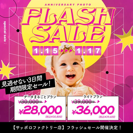 写真スタジオにおける「質」と「価格」のバランスに新しい選択肢を提案し続ける、有限会社三景スタジオ(本社:北海道旭川市、代表取締役:大西康弘)。この度、運営する「写真工房ぱれっと / Palette+plus」の一部店舗にて、2026年1月15日(木)から1月17日(土)までの3日間限定でお得なフラッシュセールを開催いたします。