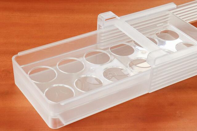 卵が12個まで入るトレーと、内側には段差付き。この段差によって、高さを7段階まで調整できるのだとか。