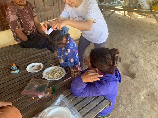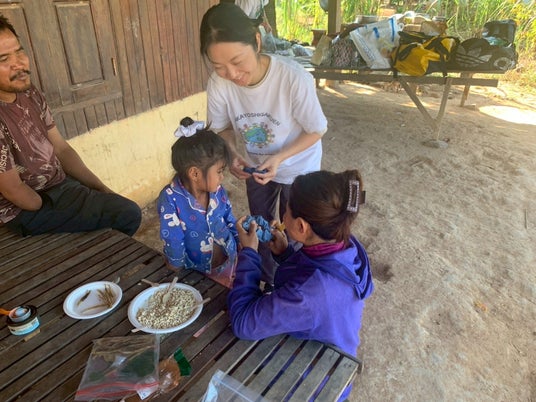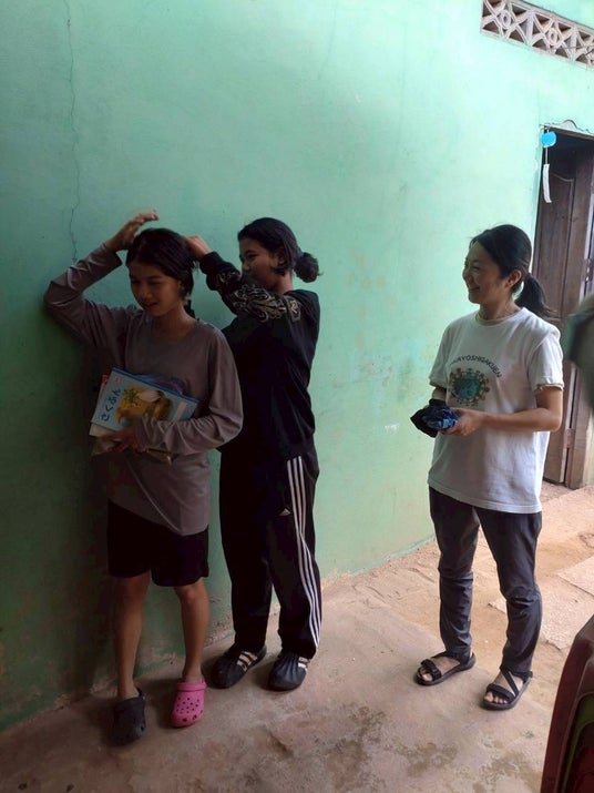 戦争被害を受けたアンロンベンの女性達にプレゼントされた矢掛高校のシュシュ