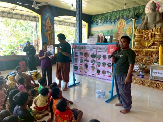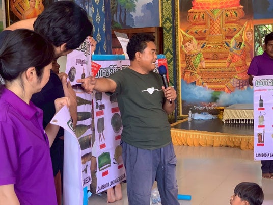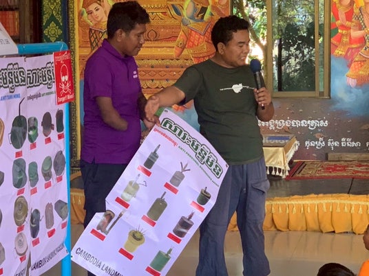 なかよし学園は、こうした環境下で子どもたちの命を守るため、現地関係者と連携し、EORE(Explosive Ordnance Risk Education:地雷・不発弾啓発授業)を実施しました。EOREは、疑わしい物に触れない、近づかない、見つけたら大人や当局に知らせる等の行動を徹底し、事故を防ぐための国際標準の教育アプローチです。 また、カンボジアの地雷問題を世界に伝え続けてきたAki Ra氏(カンボジア地雷博物館の創設者)も、同国の地雷問題の象徴的存在として広く知られています。