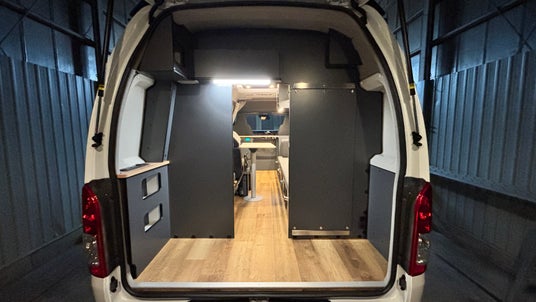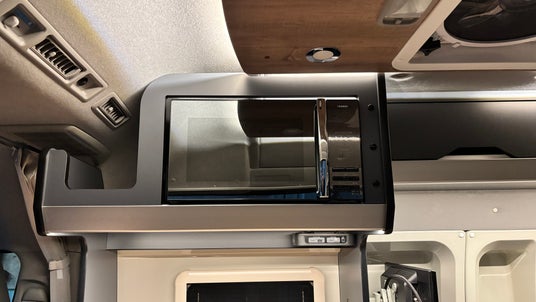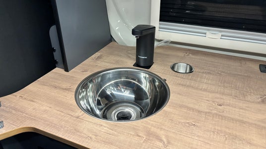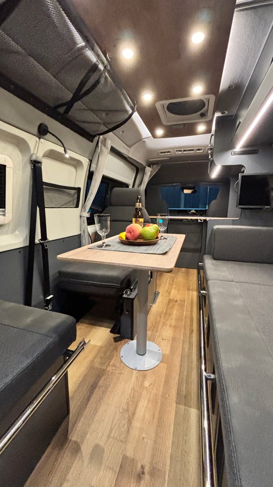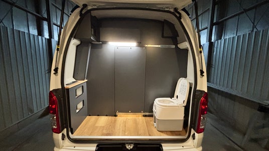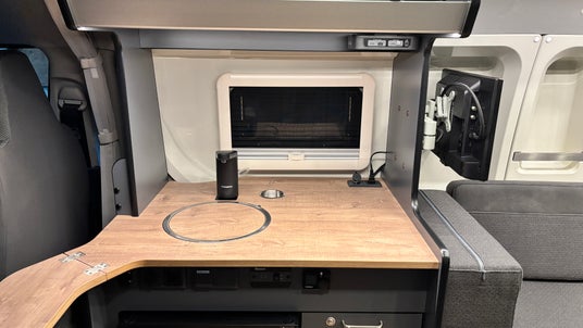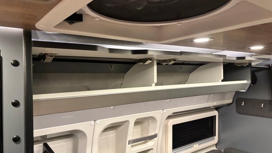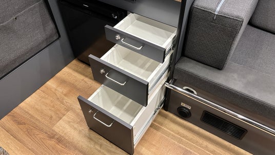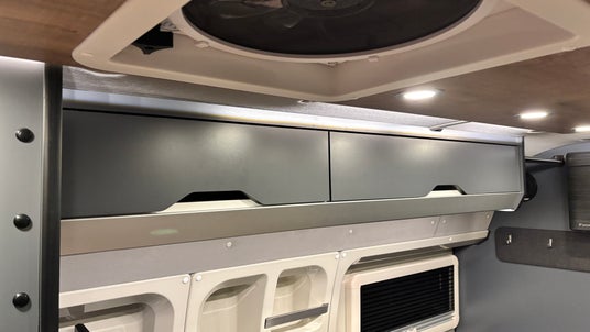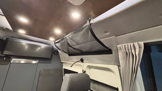 限られた車内空間を最大限に活かすため、上部には意匠性に優れた吊戸棚を配置。さらに、小物の整理に便利なネット収納を各所に設けるなど、機能美を追求しました。居住エリアの広さを損なうことなく、長期滞在に必要な荷物をスマートに収納できる設計です。