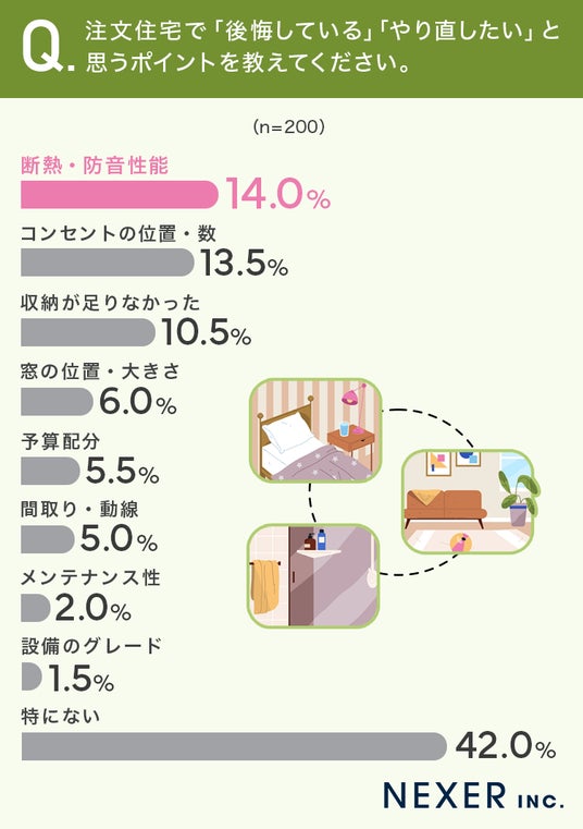 「特にない」と答えた方が42%で最も多く、約半数近くの方が現状に満足していることがわかります。一方で、後悔ポイントとして最も多かったのは「断熱・防音性能」で14%でした。「コンセントの位置・数」が13.5%、「収納が足りなかった」が10.5%と続きます。
