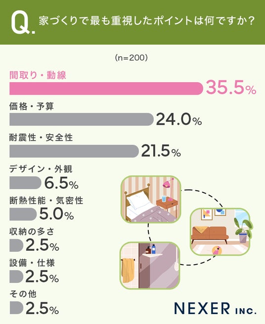 ■35.5%が家づくりで「間取り・動線」を最も重視したと回答