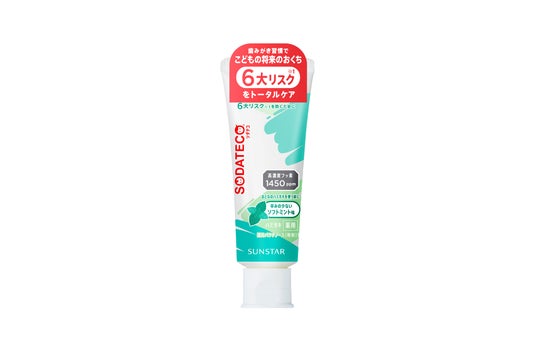 子どもの将来のおくち6大リスク※2を、歯みがき習慣でトータルケア。薬用成分フッ素1450ppm配合。歯へのカルシウムの取り込みを促進して、歯質を強化し、むし歯を予防します。大人用のハミガキを使う前のお子さま向けに辛味の少ないソフトミント味です。
