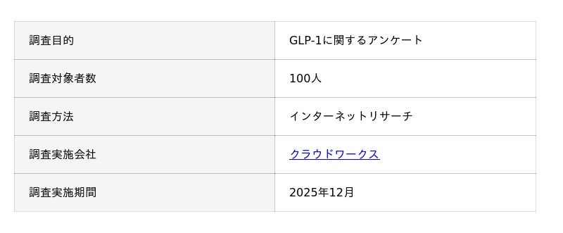 「利用したGLP-1の種類」「1ヶ月分の料金」「効果を実感するまでの期間」などの質問を行い、実際にGLP-1を利用してダイエットを行った方の実体験に基づいたデータを集めることができました。