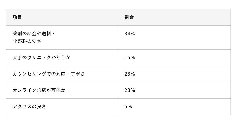 - クリニック選びは「薬剤の料金や送料・診察料の安さ」(34%)、「カウンセリングでの対応・丁寧さ」(23%)、「オンライン診療が可能か」(23%)など様々な点を重視