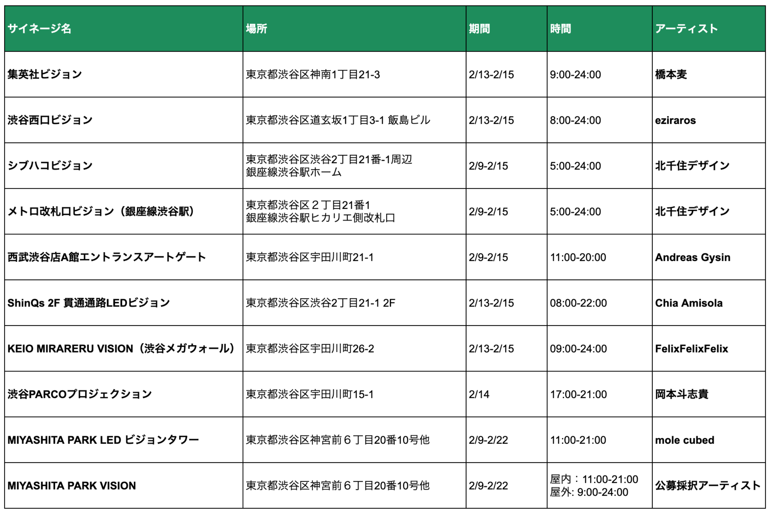 各サイネージの設置場所と展示アーティストは以下の通りです。