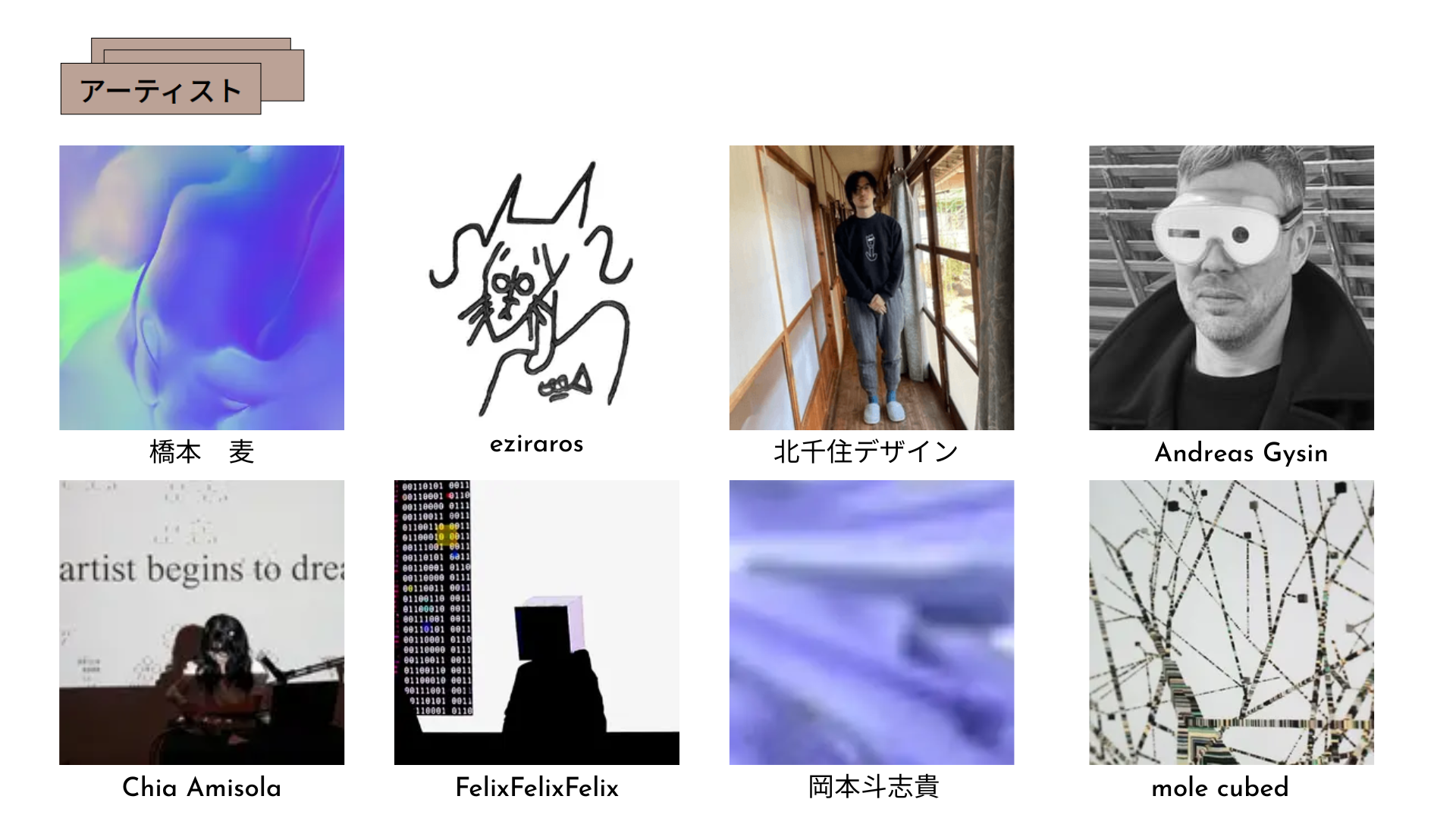 Andreas Gysin、Chia Amisola、FelixFelixFelix、mole^3、eziraros、岡本斗志貴、北千住デザイン、橋本麦