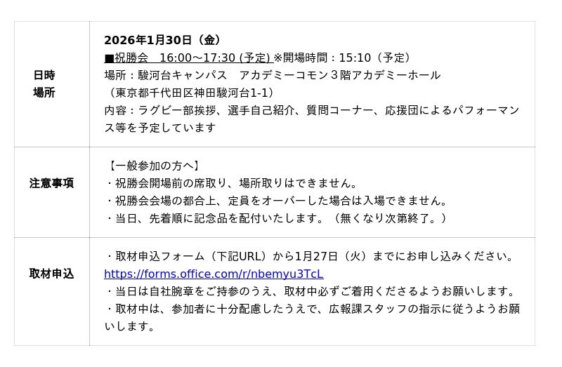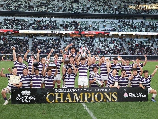明治大学体育会ラグビー部は、1月11日(日)に国立競技場(東京都新宿区)で行われた第62回全国大学ラグビーフットボール選手権大会の決勝で早稲田大学と対戦し、22-10で勝利し、7年ぶり14度目の大学日本一に輝きました。 つきましては、優勝を祝し、1月30日(金)に優勝祝勝会を以下のとおり実施します。 企業プレスリリース詳細へPR TIMESトップへ PR TIMES ママ X Facebook 関連記事 SNS総フォロワー200万超、“声まねコスプレ”のパイオニア「だいき」TimeTicket Production アンバサダーに就任 ブランド初の厚底ソールを採用した「CONS RUNBOUNCE」が登場 弘前城初開催!「弘前城雪燈籠まつり」にて「チャンバラ合戦 ~弘前城 冬の陣~」200名の侍(参加者)を募集/26年2月11日(水・祝) 巻くだけで手軽にお腹ひきしめ「ブーストブレスベルト」新発売 新年の目標達成をサポート!24回目を迎える6週間集中チャレンジ「Training Camp (トレーニングキャンプ)」を2026年2月2日 (月) より開催 1月で販売終了!『ニューオータニグルメクーポン』でホテル美食をもっと身近に。 横浜バニラ、冬季限定【塩バニラフィナンシェ ぱりとろショコラ】が初登場!フラッグシップ商品「塩バニラフィナンシェ」と贅沢2層ショコラの魅惑のマリアージュを、この冬あなたに。 【新発売】バレンタインに贈る。大人のための《夜専用》リキュール香るわらび餅「Mochi Mochi Cioccolate(モチモチ ショコラート)」【京西陣菓匠宗禅】 >学校法人明治大学イベントママ新商品PR TIMES