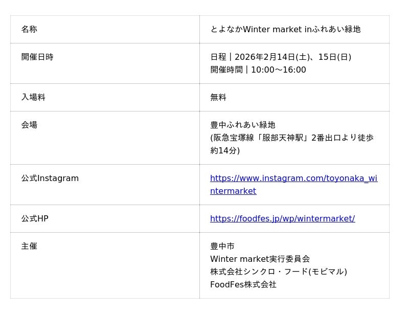 FoodFes株式会社(代表取締役:稲垣一馬)は2026年2月14日(土)・2月15日(日)の2日間、「とよなかWinter market inふれあい緑地」を豊中ふれあい緑地(大阪府豊中市)にて開催いたします。