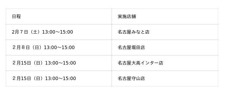 実施店舗:名古屋みなと店、名古屋堀田店、名古屋大高インター店、名古屋守山店、名古屋当知店