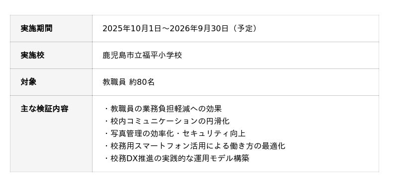 Sky株式会社は鹿児島市と共に、教職員による私用スマートフォンの利用課題に対応するための実証研究を進めています。鹿児島市立福平小学校において、校務用スマートフォンおよび弊社の校務スマート化支援アプリ「SKYMENU Mobile」を1年間導入し、効果検証に取り組みます。