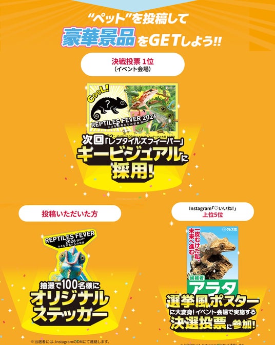 「いいね!」数上位5位は、選挙風ポスターに大変身して、イベント内で実施する決選投票に参加できます。決選投票で一位に輝いた生き物は、次回開催の『レプタイルズフィーバー』キービジュアルに採用!