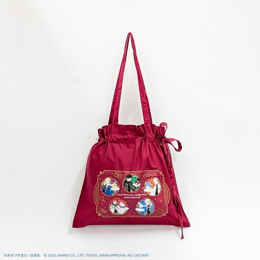 絞った紐を結べば、可愛いリボンにもなる大きさ約40cm×35cmのコットンバッグ。今回、同時に発売したマット加工缶バッジをつけて、アレンジを楽しむのも◎