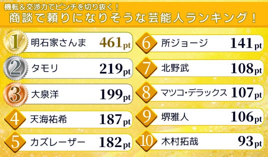 第1位に輝いたのは、明石家さんまです。長年テレビ番組で培ってきた話術や持ち前のユーモアで場を和ませ、商談のピンチを救ってくれそうという声が多く寄せられました。頭の回転がはやく、相手への切り返しがうまい点も高い評価につながっています。