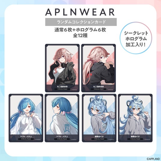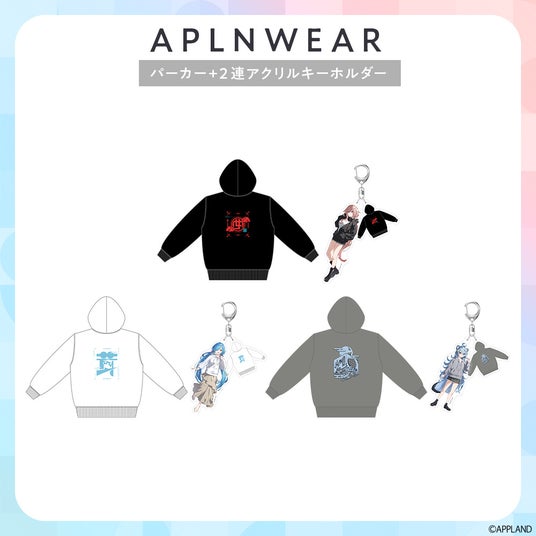 『アプランウェア』第3弾では、もこ田めめめ、ヤマト イオリ、綿貫ねぐせをイメージしたカジュアルで着やすいパーカーに加え、本アパレル着用のイメージビジュアルを使用したアクリルスタンドや缶バッジなど、全4種類のグッズが登場!