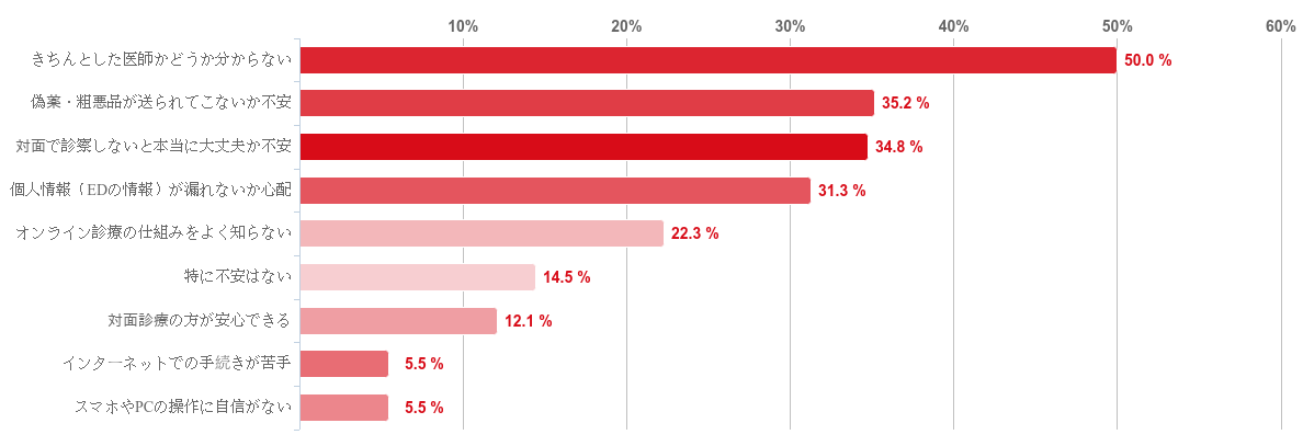 「きちんとした医師かどうか分からない」が50.0%と半数となり最も多かった。また、「特に不安はない」と回答した人は1割程度と少数となり、回答者の多くが、EDのオンライン診療に対して何らかの不安を感じていることがわかった。