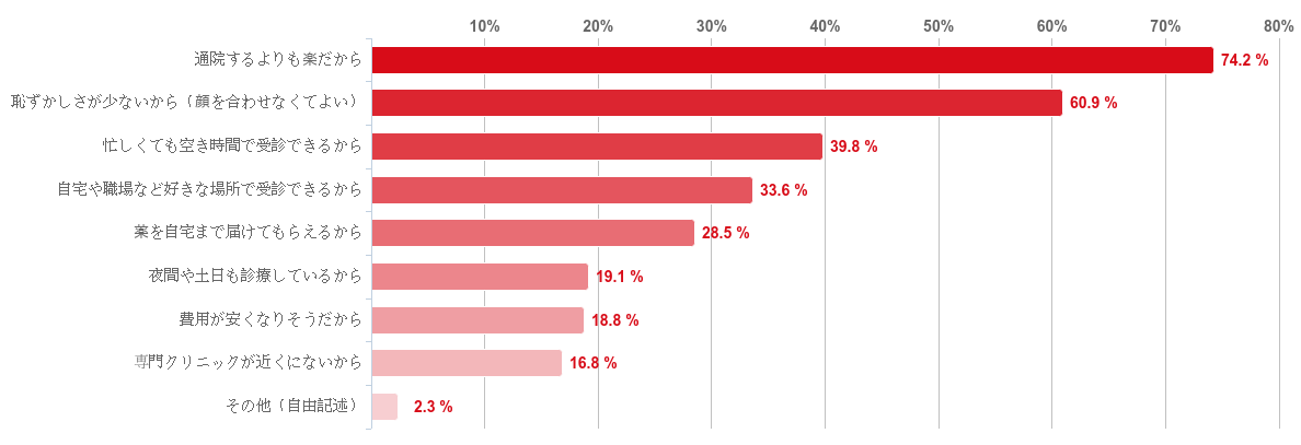 「通院するよりも楽だから」との回答が74.2%で最も多かった。次に「恥ずかしさが少ないから(顔を合わせなくてよい)」との回答が60.9%で上位2つの理由が6割を超えて多く集まった。
