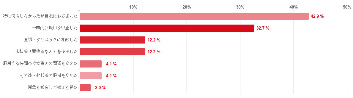 「特に何もしなかったが自然におさまった」との回答が42.9%で最も多く、「一時的に服用を中止した」との回答が32.7%、「医師・クリニックに相談した」と「市販薬(頭痛薬など)を使用した」が同率で12.2%という順となった。