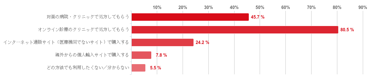 「オンライン診療のクリニックでの処方」と回答した人が42.4%で最も多く、続いて「対面の病院・クリニックでの処方」との回答が22.2%だった。また、「一般のインターネット通販サイト」と「海外からの個人輸入サイト」との回答が共に11.1%、「友人・知人などから分けてもらった」との回答が10.1%という順となった。