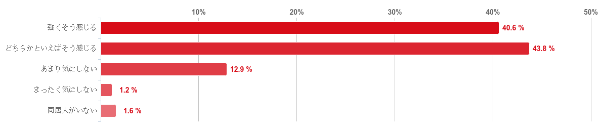 「どちらかといえばそう感じる」と回答した人が43.8%で最も多く、続いて「強くそう感じる」が40.6%となった。反対に、「まったく気にしない」と回答した人はほとんどいなかった。