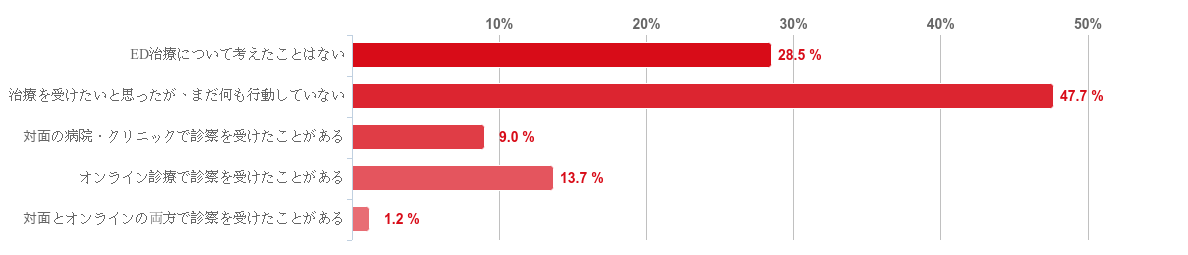 「治療を受けたいと思ったが、まだ何も行動していない」と回答した人が47.7%で最も多く、続いて「ED治療について考えたことはない」が28.5%となった。ED治療の経験がある人は回答者全体の2割程度だった。