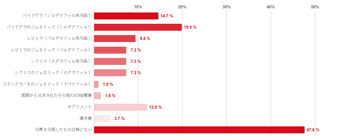「効果を実感したものは特にない」との回答が47.6%で最も多かったが、「効果を実感した」ものとして、「バイアグラのジェネリック(シルデナフィル)」が19.9%、「バイアグラ(シルデナフィル先発品)」が14.7%、「サプリメント」が12.0%という順となった。