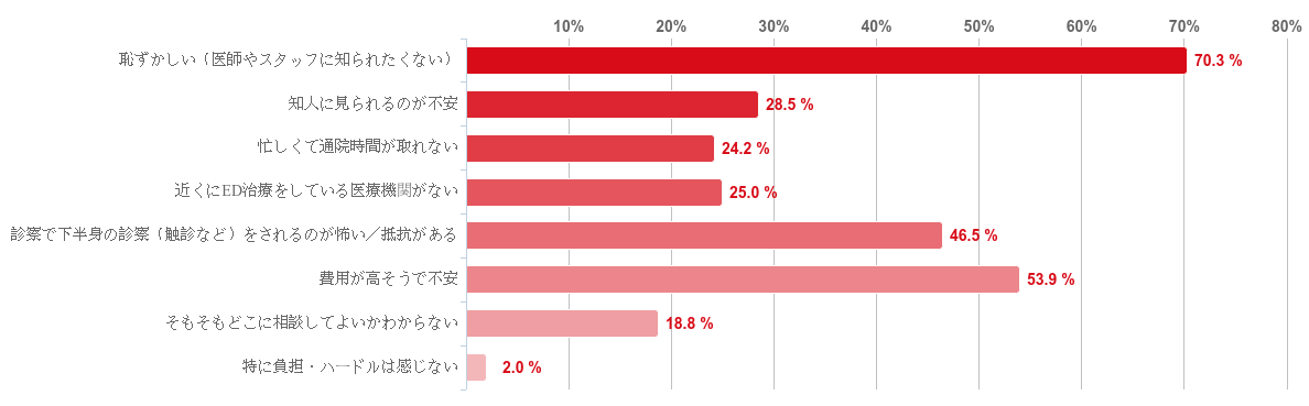 「恥ずかしい(医師やスタッフに知られたくない)」を選んだ人が70.3%と圧倒的に多く、続いて「費用が高そうで不安」が53.9%、「診察で下半身の診察(触診など)をされるのが怖い/抵抗がある」が46.5%という順となった。回答者のほとんどが、ED治療のために病院・クリニックへ「通院」する際に何らかの負担やハードルを感じていることがわかった。