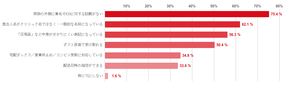 「荷物の外側に薬名やEDに関する記載がない」との回答が75.4%と7割を超えて最も多く、次いで「差出人名がクリニック名ではなく、一般的な名称になっている」が62.1%、「日用品」など中身が分かりにくい表記になっている」が56.3%、「ポスト投函で受け取れる」が50.4%と5割を超える回答を集めた。
