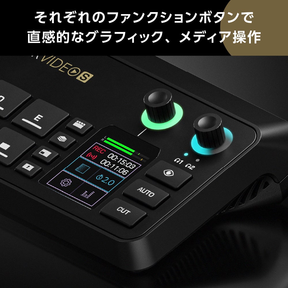 最大4つの映像ソースと9つの音声ソースの入力に対応しており、メディアプレイヤー、ダウンストリームキーヤー、シーン作成など、多機能なツールを搭載し、1080pの高画質配信が可能です。