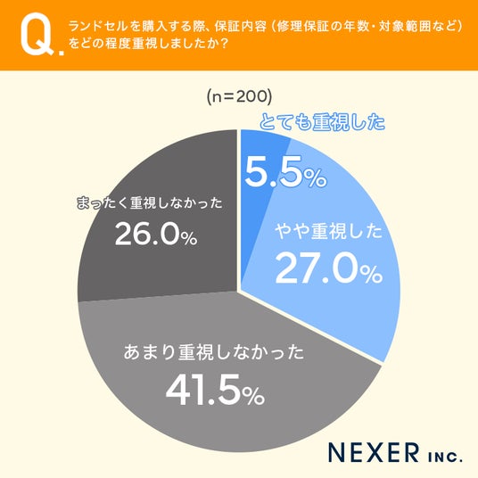 その結果「とても重視した」と答えた人は5.5%、「やや重視した」は27%となり、あわせて32.5%の保護者が、保証内容を意識してランドセルを選んでいることがわかりました。