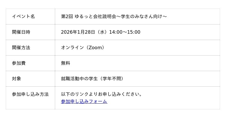 株式会社ITreat(本社:岐阜県岐阜市)は、学生のみなさんを対象としたオンラインイベント「第2回 ゆるっと会社説明会」を、2026年1月28日(水)14:00~15:00に開催します。