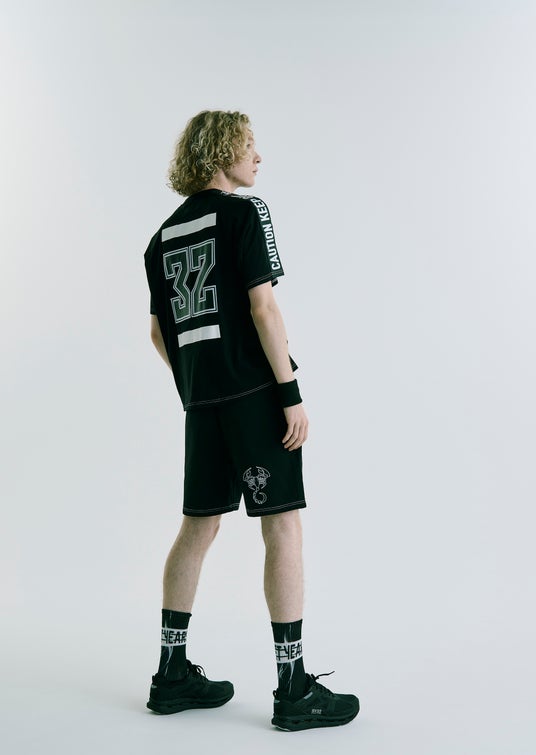 バックには大きく32の背番号のグラフィックを配置。両袖にはKEEP OUTテープのグラフィックを贅沢に配置しました。