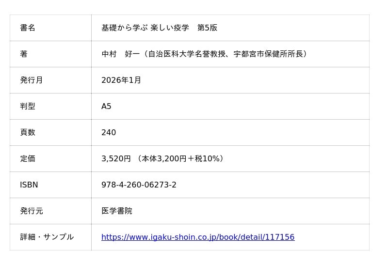 株式会社医学書院 (所在地:東京都文京区 代表取締役社長:金原 俊)は、新刊『基礎から学ぶ 楽しい疫学 第5版』(著 中村好一)を2026年1月19日に刊行します。