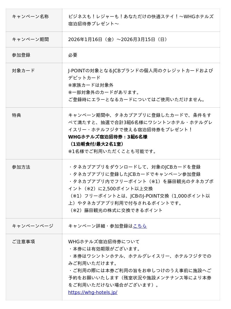 株式会社ジェーシービー (本社:東京都港区、代表取締役会長 兼 執行役員社長:二重 孝好、以下:JCB)は、1株からの株式投資体験を通じて企業のファン育成を支援するポイント投資アプリ『タネカブ』に参画する藤田観光株式会社(本社:東京都文京区、代表取締役兼社長執行役員:山下 信典、以下:藤田観光)と共同して、「ビジネスも!レジャーも!あなただけの快適ステイ~WHGホテルズ宿泊招待券プレゼント~」を実施することをお知らせいたします。