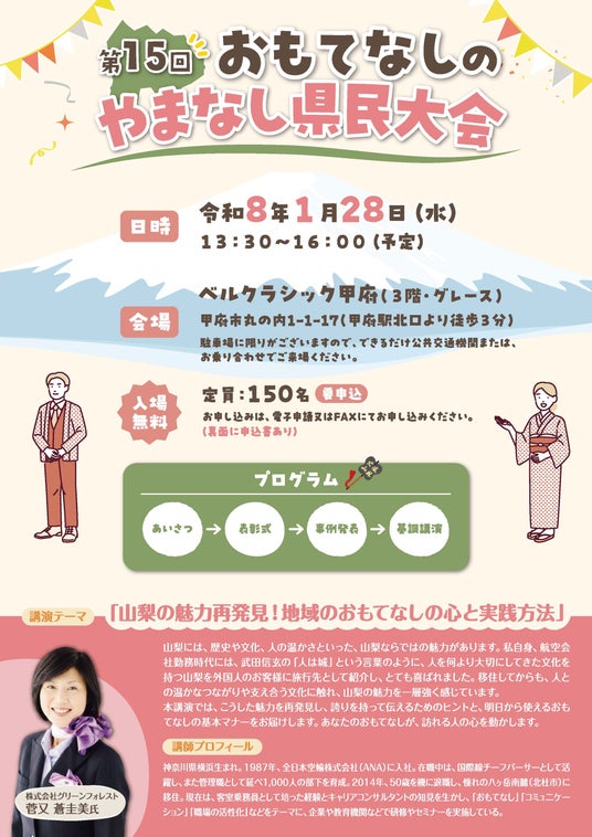 その一環として、毎年2月1日から7日を「おもてなし推進週間」と定め、同週間の始まりを前に、「おもてなしのやまなし県民大会」を開催しています。本大会では、優れたおもてなしを実践する県民や事業者を表彰し、事例発表や基調講演を通じて、山梨ならではのおもてなしを県内全域に展開しています。