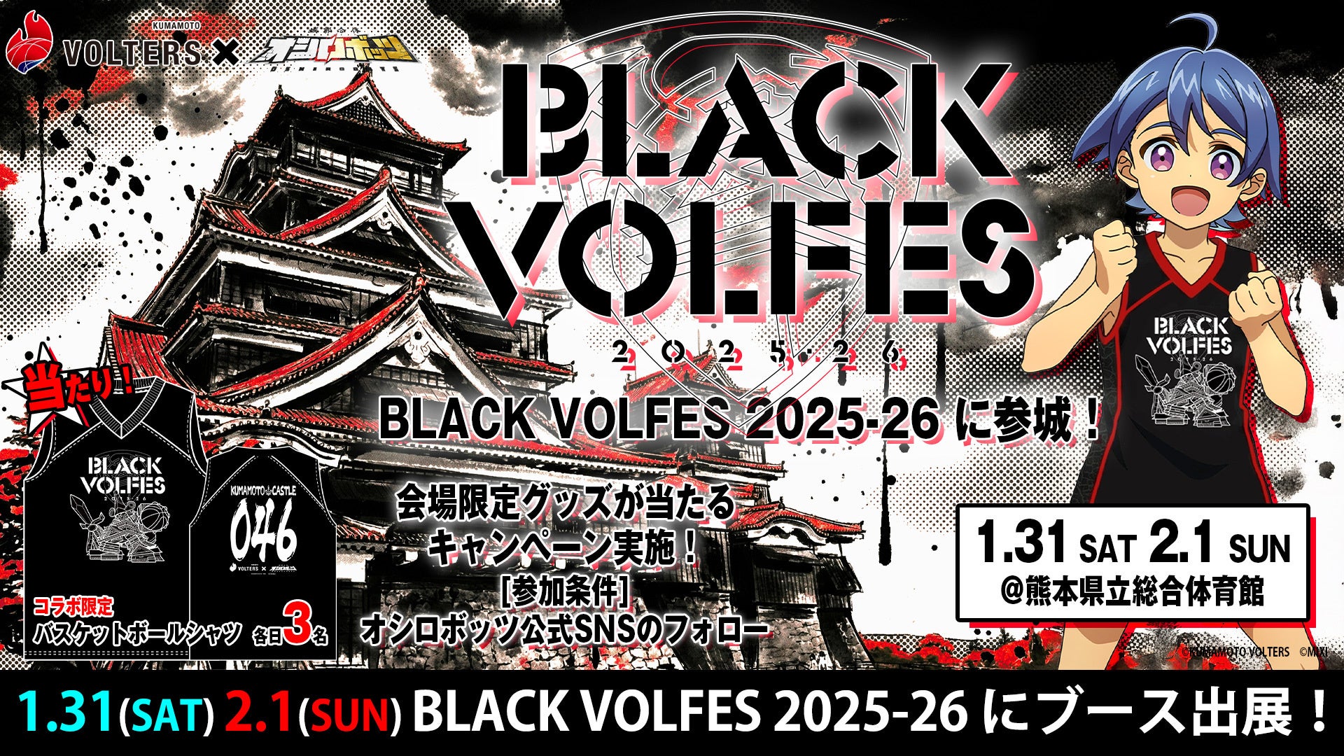 株式会社MIXI(東京都渋谷区、代表取締役社長 上級執行役員 CEO:木村 弘毅)は、2026年1月31日(土)~2月1日(日)に熊本県立総合体育館で開催される「BLACK VOLFES 2025-26」にMIXI_ANIMEオリジナルコンテンツ『城郭合体オシロボッツ』を出展し、ノベルティ配布とコラボ限定バスケットボールシャツをはじめとした会場限定グッズが当たるキャンペーンを実施します。