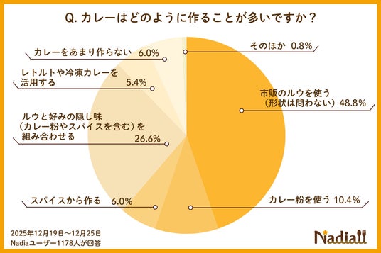 1月22日はカレーの日ですが、帝国データバンクの調査によると「カレーライス物価指数」が過去最高を更新しています(※2)。そこでカレーに関してNadiaユーザーにアンケートを行ったところ、カレーを作る際「市販のルウを使う」人は7割超(71.4%)という結果に。さらにそのうち約4割(37.3%)が、「ルウと好みの隠し味(カレー粉やスパイスを含む)を組み合わせる」と回答しました。具材については、「じゃがいも・にんじん・玉ねぎ」の定番野菜が約8割(78.3%)と圧倒的な人気を誇り、肉類だと豚肉が主流となっています。