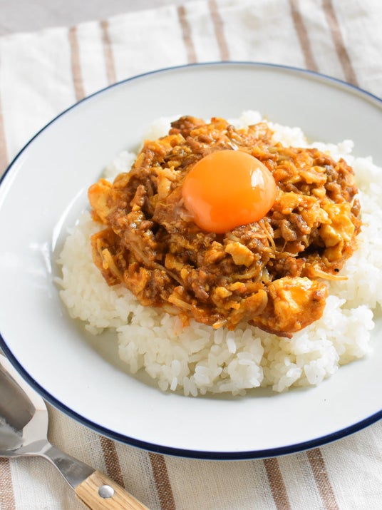 【ひき肉と豆腐のキーマカレー】半熟卵のせ(ハート)豆腐そぼろで節約♪ byRINATY(りなてぃ)さん