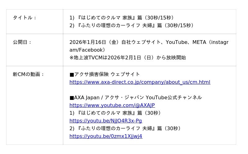 アクサ損害保険株式会社(本社:東京都台東区、代表取締役 社長兼CEO:田中 勇二郎、以下「アクサ損害保険」)は、「アクサダイレクト総合自動車保険」の新CM『はじめてのクルマ 家族』篇と『ふたりの理想のカーライフ 夫婦』篇を2026年1月16日(金)から同社Webサイトおよび公式YouTubeで公開し、2月1日(日)からは地上波TVCMとして放映を開始します。
