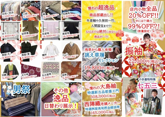 リユース着物や帯、小物が大集結。掘り出し物に出会える4日間、事前予約で期間中に使える500円クーポンをプレゼント。