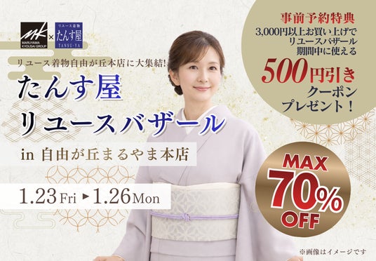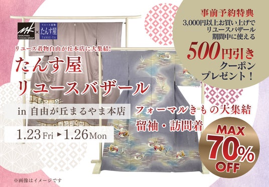 まるやま・京彩グループ、自由が丘まるやま本店では、1月23日(金)~26日(月)の4日間、リユース着物が当社通常販売価格から最大70%OFFとなる「リユースバザール in 自由が丘まるやま本店」を開催いたします。