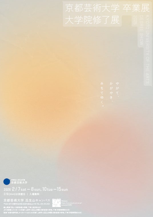 本学の通学課程では、2026年2月7日(土)から15日(日)まで「京都芸術大学 卒業展・大学院修了展」を開催します。同展では80,000平方メートル を超える瓜生山キャンパスで学生たちの卒業制作作品を一堂に展示。会期中には、学科ごとに教員やゲスト講師による講評会を対面・オンラインで実施します。